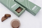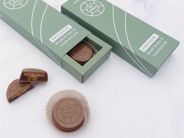 Een doosje met 4 Van Heekjes. Dit streekproduct bestaat uit een crunchy koekbodem met een zachte en sticky caramel pinda vulling, omhuld met chocolade
